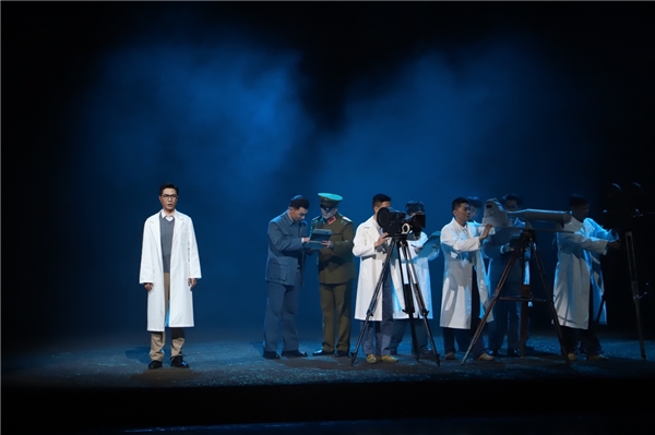 在高水平歌剧演出的基础上,《青春铸剑221》加入了即时拍摄、视频投影等技术手段,以现代科技丰富舞台表现形式。同时特别设置一组“颂唱者”角色,他们时而是当代青年,时而是剧中角色,以澎湃直白的情感表达,吸引观众的目光聚焦在那段光辉岁月中每一个亲历者身上,记述他们“干惊天动地事,做隐姓埋名人”的一生奉献。