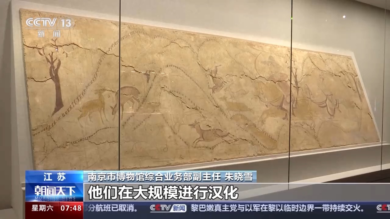 南京市博物馆综合业务部副主任 朱晓雪:这两幅壁画的主题是北朝狩猎图,他们在大规模进行汉化向中华文明主动靠拢过程当中,和我们中华文明进行了融合,与此同时他们也保留了自身游牧民族的一些文化传统,所以我们从这两幅狩猎图当中能看到他们策马奔腾游猎于山林间。