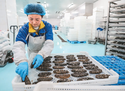 辽宁省大连市蛋坨子岛周边海域是刺参原种场保护区。在辽宁省海洋水产科学研究院和大连棒棰岛海产股份有限公司管理下,该保护区已成为海产品“种子银行”,刺参数量超100万头。图为工人在辽宁大连棒棰岛海产股份有限公司生产车间整理海参产品。 |