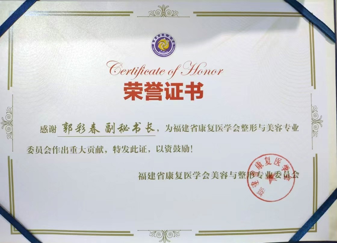 郭彩春:作为福建省康复医学会整形与美容分会的秘书长,我在本职工作之余,也积极参与各种社会活动。我希望通过我的专业知识和努力,能够帮助更多的人,为社会做出更多的贡献。我相信,每一位医生都应该承担起社会责任,用自己的力量去影响和改善社会。