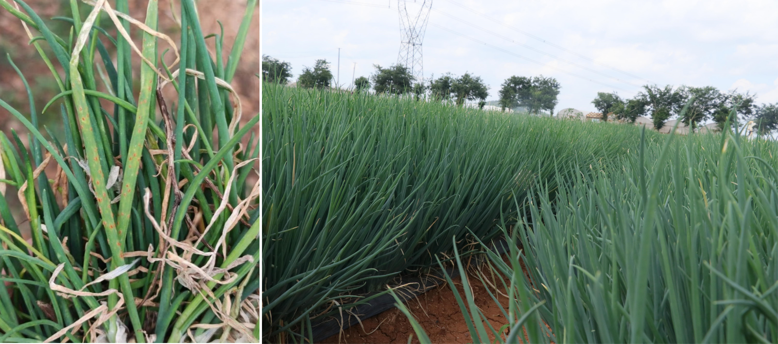 左图为常见的香葱病害发生情况;右图为病害综合防控示范区的香葱,植株生长良好。