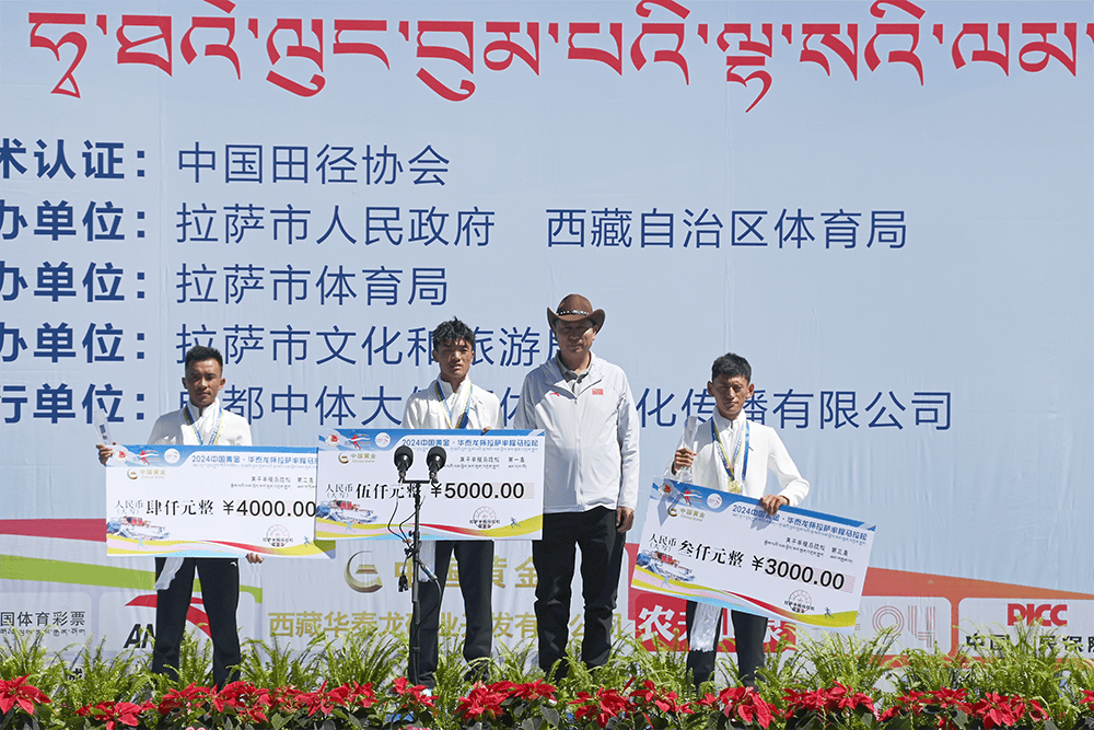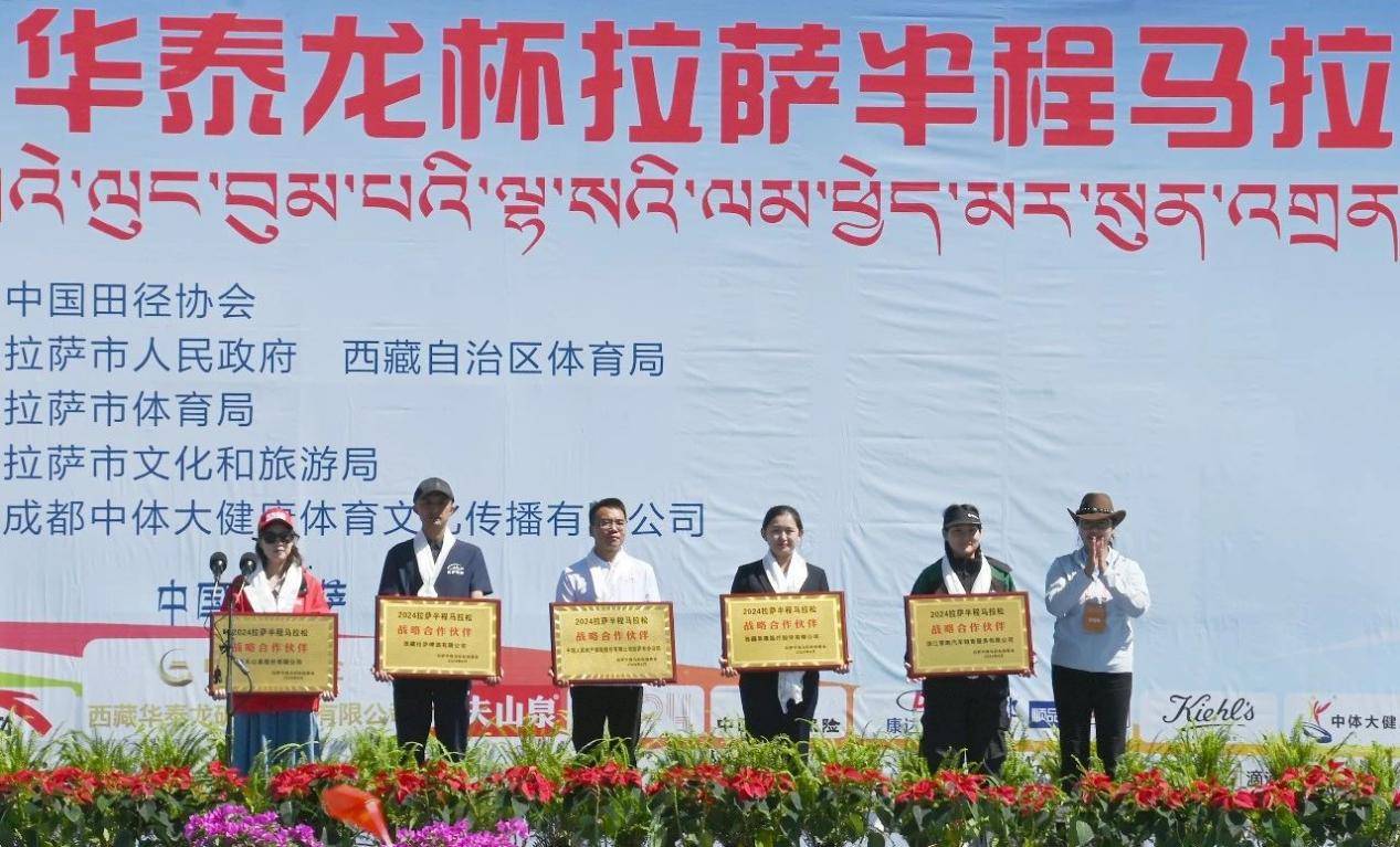 在比赛圆满落幕时,拉萨市体育局党组副书记、局长米玛琼达代表赛事组委会向浙江零跑汽车销售服务有限公司、西藏阜康医疗股份有限公司、中国人民财产保险股份有限公司拉萨市分公司、西藏拉萨啤酒有限公司以及农夫山泉股份有限公司的代表们颁发了2024拉萨半程马拉松战略合作伙伴奖,感谢他们对赛事的支持与贡献。