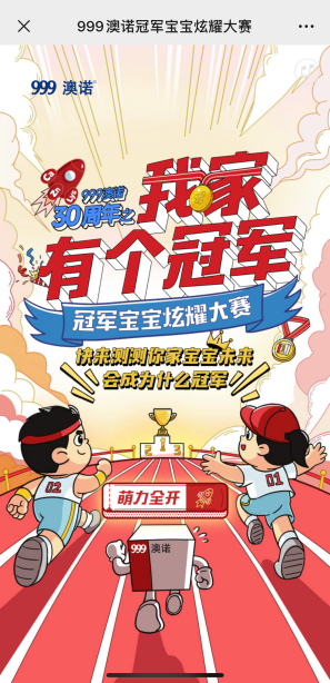 999澳诺钙锌品类领先品牌,“葡萄糖酸钙锌口服溶液”自1996年上市以来,受到广大消费者的认可。用30年来的专注追求冠军般的品质走进亿万中国家庭,助力中国宝宝健康快乐,向上生长。999澳诺作为默默陪伴家庭成长的一份子,给出了自己的答案:在999澳诺品牌三十周年「我家有个冠军」这一营销大主题之下,999澳诺将冠军荣誉与个体的家庭生活巧妙地联系到一起,「家」不仅是小家,也是亿万小家汇聚起的中国;「冠军」不仅是赛场上的冠军,也是家庭里冠军。999澳诺想为每一位家庭成员发声,去发现、去看见每一位家庭成员的高光时刻,为家里的每一位冠军“加冕”。