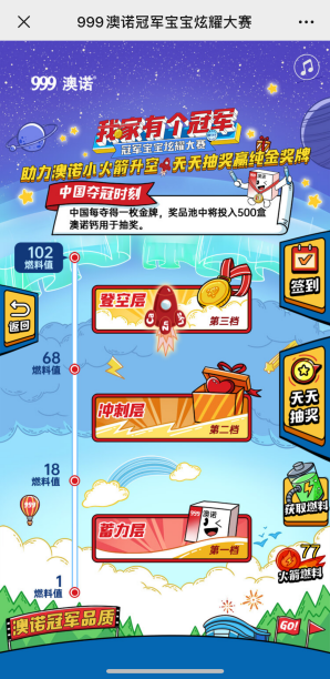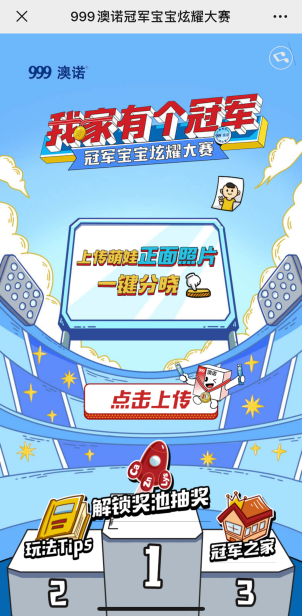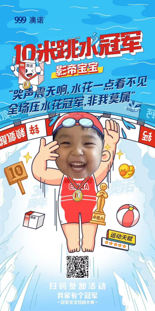 运动健儿们圆梦赛场有嘉奖,999澳诺也为“钙世小冠军”宝宝提供了最热烈的庆祝仪式,一同分享这份荣耀和喜悦。本次在微信端设计颇具特色的我家有个冠军创意互动H5 ,通过简易的图片上传操作,便能随机生成以不同运动赛事运动员为形象的换脸版“冠军宝宝”趣味海报,以炫耀晒照的形式,和多重产品好礼、趣味周边与产品惊喜实现了超过10000人来参与打卡互动,收获每个父母眼里宝宝值得骄傲的冠军时刻,实现爱的见证与奔赴。