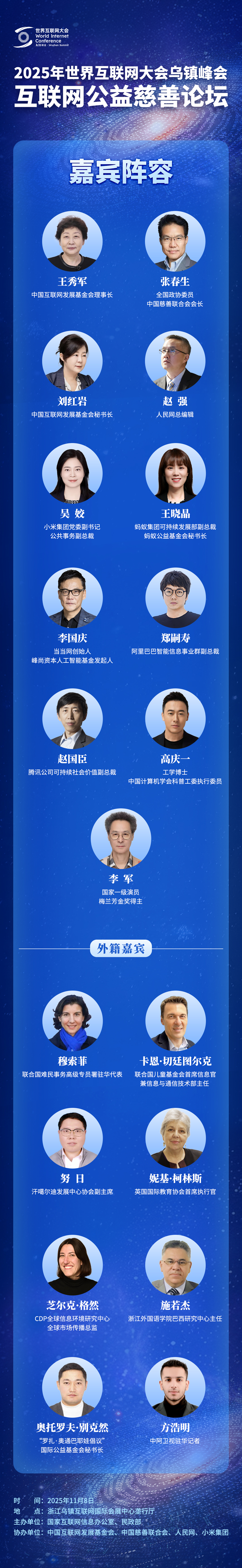 人民网乌镇11月7日电 (记者王金雪、赵竹青)2025年世界互联网大会乌镇峰会互联网公益慈善论坛将于11月8日上午在浙江乌镇互联网国际会展中心垄行厅举行。本次论坛由国家互联网信息办公室、民政部主办,中国互联网发展基金会、中国慈善联合会、人民网、小米集团协办。