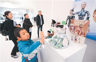 北京中关村国际创新中心内,一名小朋友在“2025人工智能+”大会展区上与AI陪伴玩具互动。 |