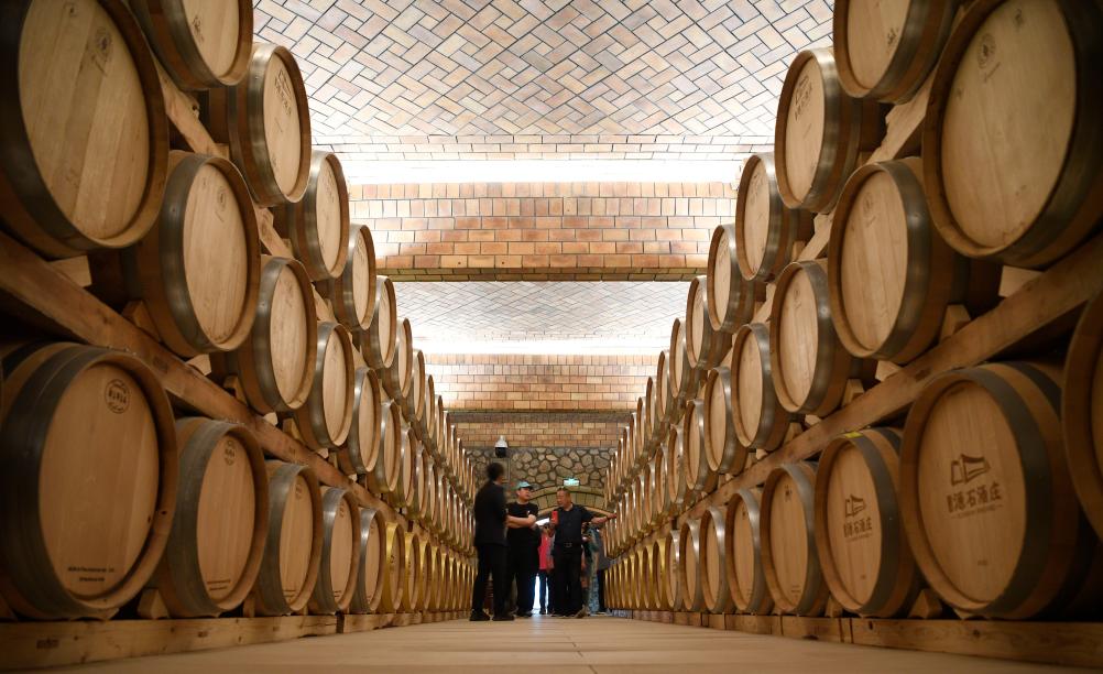 在位于贺兰山东麓的志辉源石酒庄,游客在酒窖参观游览。新华社记者 王鹏 摄