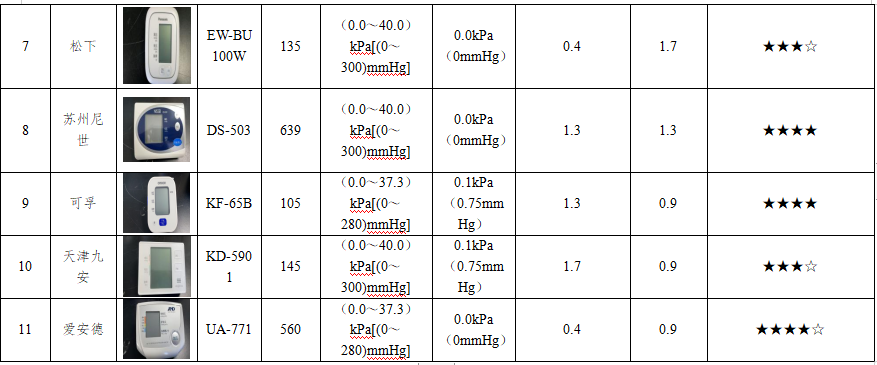 此次比较试验选取不同品牌的11款样品,分别是欧姆龙(U701、U738T、U725、HEM-7132),鱼跃(S68XR、YE666AR),松下(EW-BU100W),苏州尼世(DS-503),可孚(KF-65B),天津九安(KD-5901)以及爱安德(UA-771)。测试依据JJG 692—2010《无创自动测量血压计检定规程》,检测静态压力测量范围、静态压力示值误差和血压示值重复性等技术指标,通过数据展现各品牌型号样品的性能参数,为消费者选购提供参考。