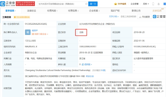 根据企查查APP显示,近日,长兴水恋沙文化传媒合伙企业(有限合伙)发生工商变更,企业状态由存续变更为注销。