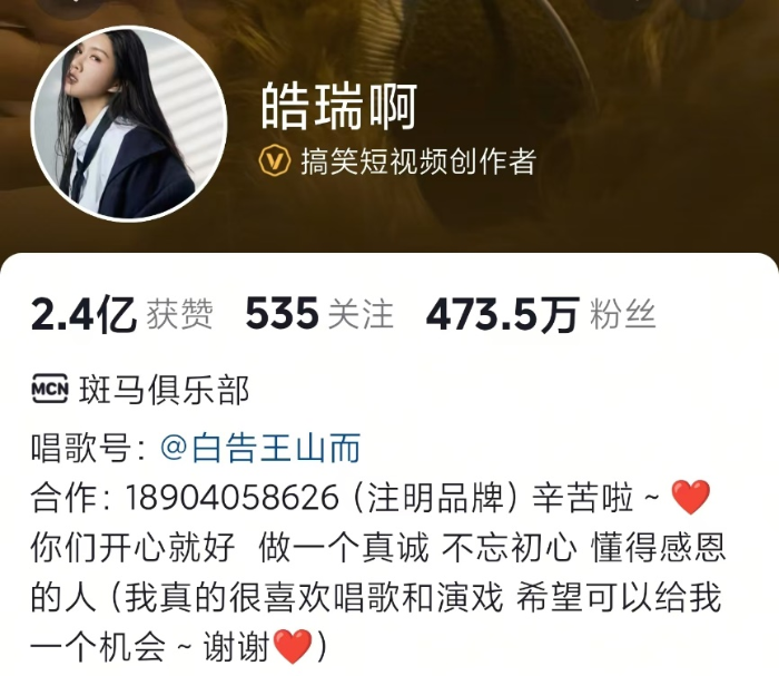 白皓瑞有两个账号:一个是有近500万粉丝的搞笑号“皓瑞啊”,一个只有74.2万粉丝的唱歌号“白告王山而”。