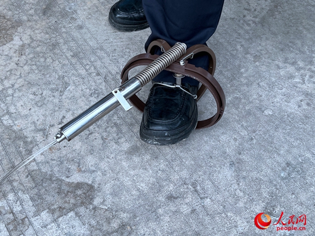 它的威力有多大?民警在现场进行了试验。只要轻轻踩上捕猎夹的底座,就会立即触发猎套,“咔哒”一声,以极快的速度将脚牢牢缠住。所以,这种捕猎夹虽然看起来结构简单,但一旦踩入,几乎没有挣脱的可能。