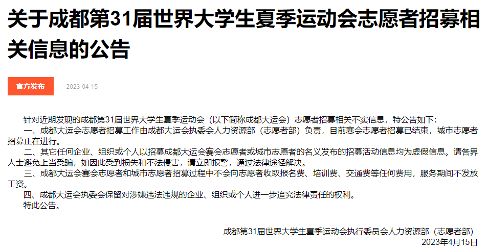 针对网传信息,4月15日,成都第31届世界大学生夏季运动会执行委员会人力资源部(志愿者部)通过官方网站发布公告,称其它任何企业、组织或个人以招募成都大运会赛会志愿者或城市志愿者的名义发布的招募活动信息均为虚假信息。