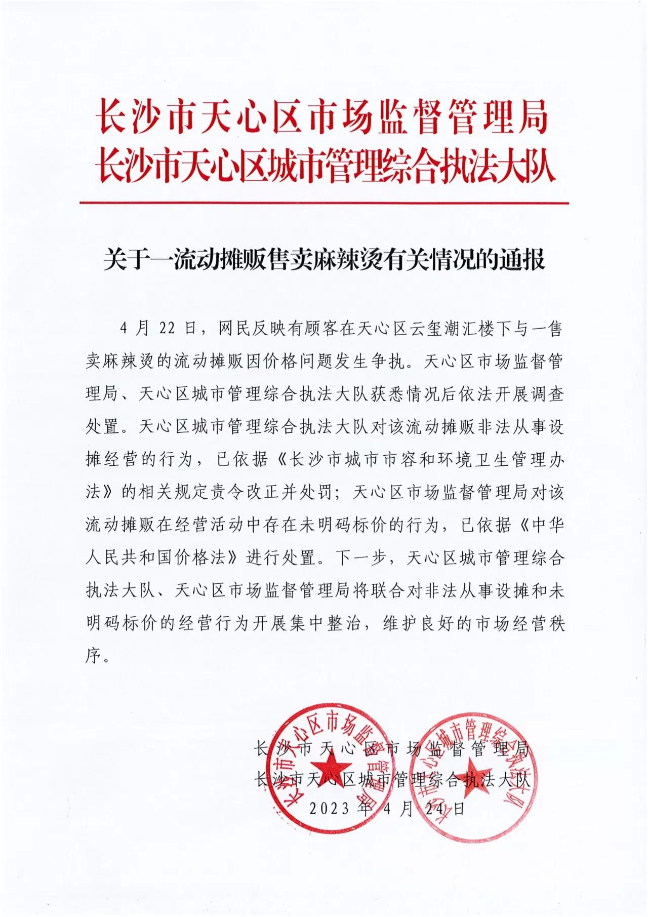 中新网4月24日电 日前,有媒体报道称,4月22日晚,一对山东游客在湖南长沙太平街街头一个路边摊买了一碗麻辣烫,价格达86元,引发网友关注。长沙市天心区市场监督管理局、长沙市天心区城市管理综合执法大队24日通过天心区委网信办官方微信发布《关于一流动摊贩售卖麻辣烫有关情况的通报》称,4月22日,网民反映有顾客在天心区云玺潮汇楼下与一售卖麻辣烫的流动摊贩因价格问题发生争执。天心区市场监督管理局、天心区城市管理综合执法大队获悉情况后依法开展调查处置。