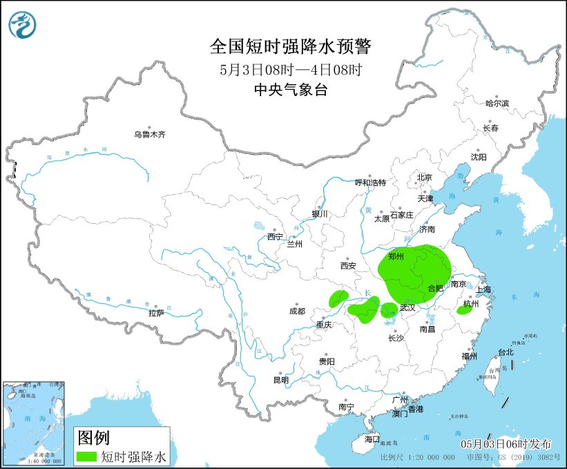 预计5月3日08时至4日08时,河南东部和南部、安徽中北部、湖北东部等地的部分地区将有8-10级雷暴大风或冰雹天气;山东南部、河南中东部和南部、安徽中北部、江苏西北部、湖北东部和西南部、湖南北部、四川东北部、重庆东北部等地的部分地区将有短时强降水天气,小时雨量20-40毫米,局地可达50毫米以上。