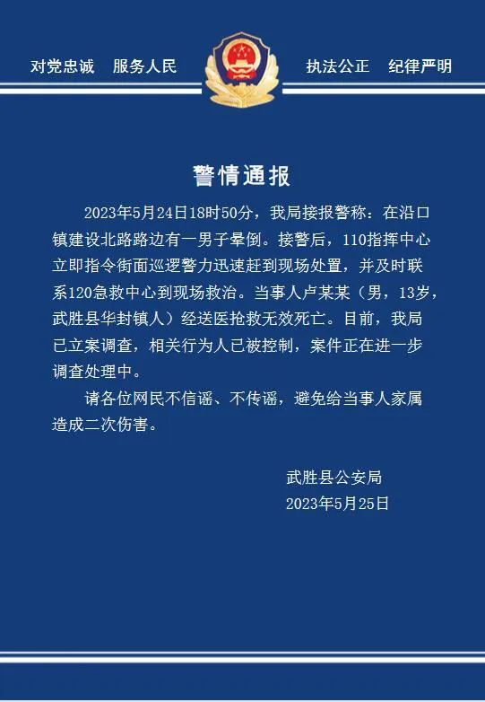 人民网北京5月25日电 (记者梁秋坪、郝萍)四川省广安市武胜县公安局25日发布通报称,2023年5月24日18时50分,我局接报警称:在沿口镇建设北路路边有一男子晕倒。接警后,110指挥中心立即指会街面巡逻警力迅速赶到现场处置,并及时联系120急救中心到现场救治。当事人卢某某(男,13岁,武胜县华封镇人)经送医抢救无效死亡。目前,我局已立案调查,相关行为人已被控制,案件正在进一步调查处理中。