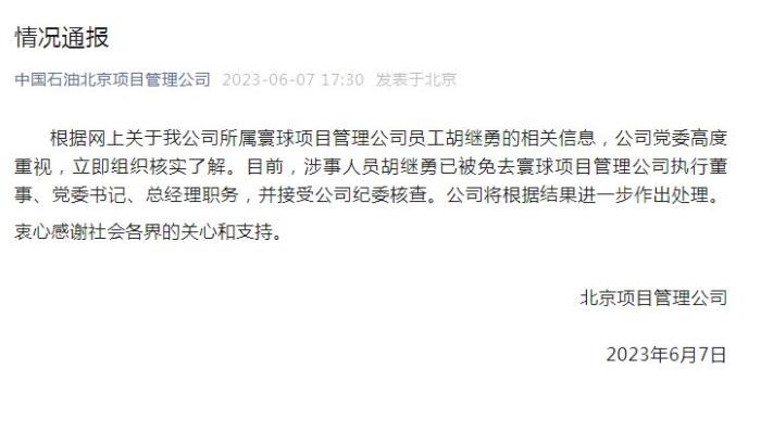 中新网6月7日电 中国石油北京项目管理公司7日发布情况通报称,根据网上关于我公司所属寰球项目管理公司员工胡继勇的相关信息,公司党委高度重视,立即组织核实了解。目前,涉事人员胡继勇已被免去寰球项目管理公司执行董事、党委书记、总经理职务,并接受公司纪委核查。公司将根据结果进一步作出处理。衷心感谢社会各界的关心和支持。