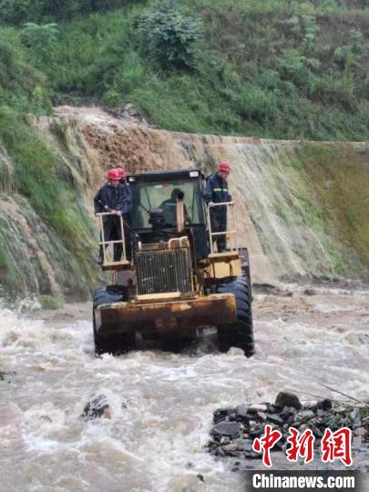 图为7月30日,抢修工作人员乘坐铲车前往邯郸武安古武当山地区进行电力抢修。徐建锋 摄