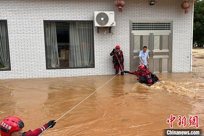 27日6时36分,强降雨导致宜都市王家畈村金沟泉养殖基地涨水,7人被困房内。由于道路被洪水淹没,消防救援人员携带橡皮艇、水域救援装备涉水前往被困者家中。房屋处于低洼地势,现场水流湍急,地势复杂,最深处已达3米。消防救援人员在村干部的带领下沿着半山腰开辟救生通道,并在牵引绳的保护下成功将7名被困人员转移至安全地带。