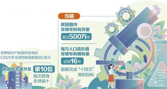 近日,记者从全国知识产权局局长会议上了解到,我国知识产权创造质量持续提高。当前,我国国内发明专利有效量超过500万件,每万人口高价值发明专利拥有量达到16件,超额完成“十四五”规划目标。世界知识产权组织发布的《2025年全球创新指数报告》显示,我国排名提升至第10位,首次跻身全球前十。