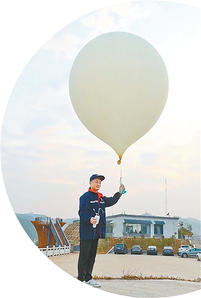 广东河源国家高空气象观测站,观测员施放北斗导航智能探空气球。 |