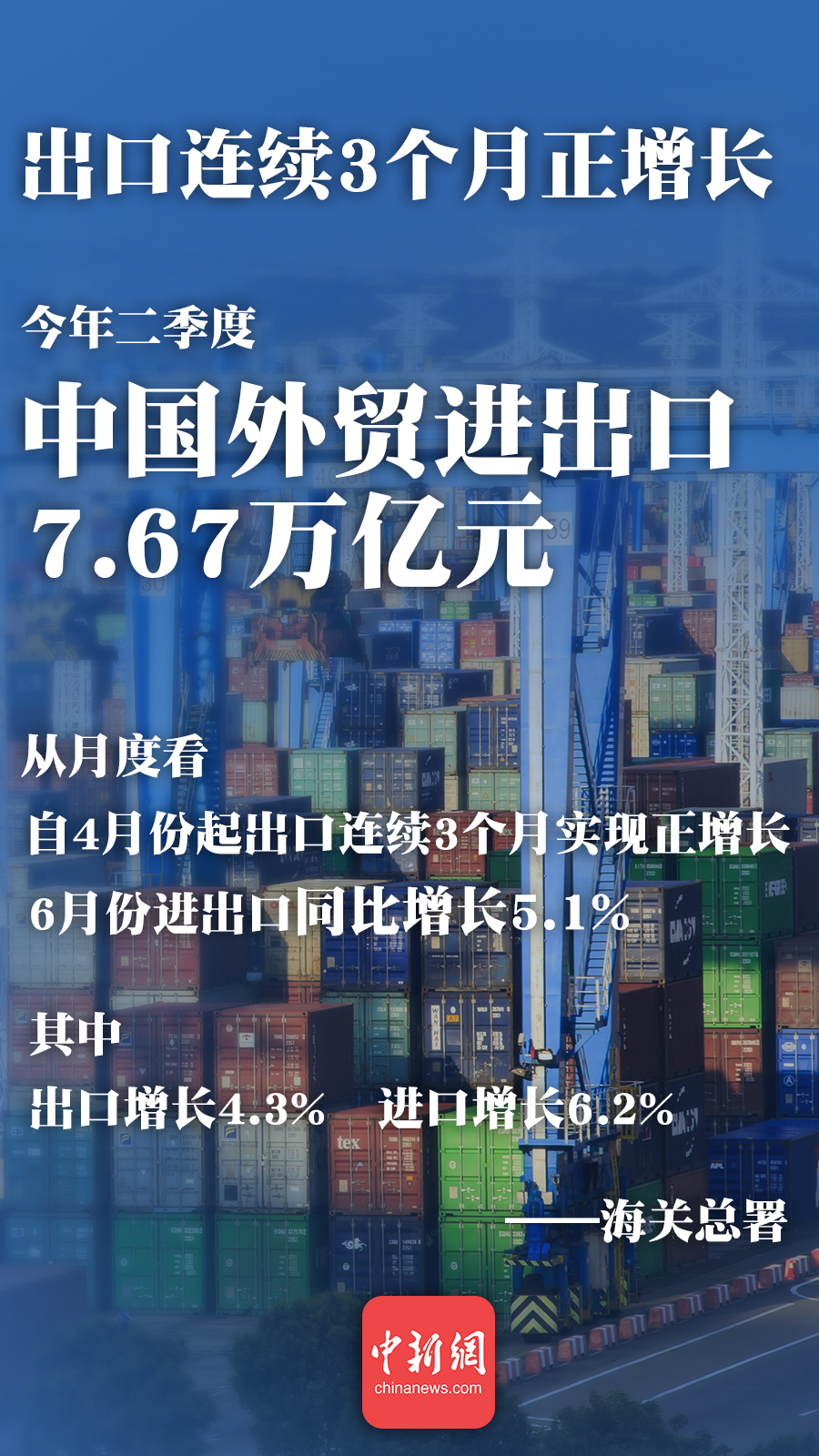 出口连续3个月正增长。海关总署数据显示,上半年外贸进出口整体表现好于预期。6月份当月进出口实现年内首次双双正增长。出口自4月份起连续三个月保持同比正增长。