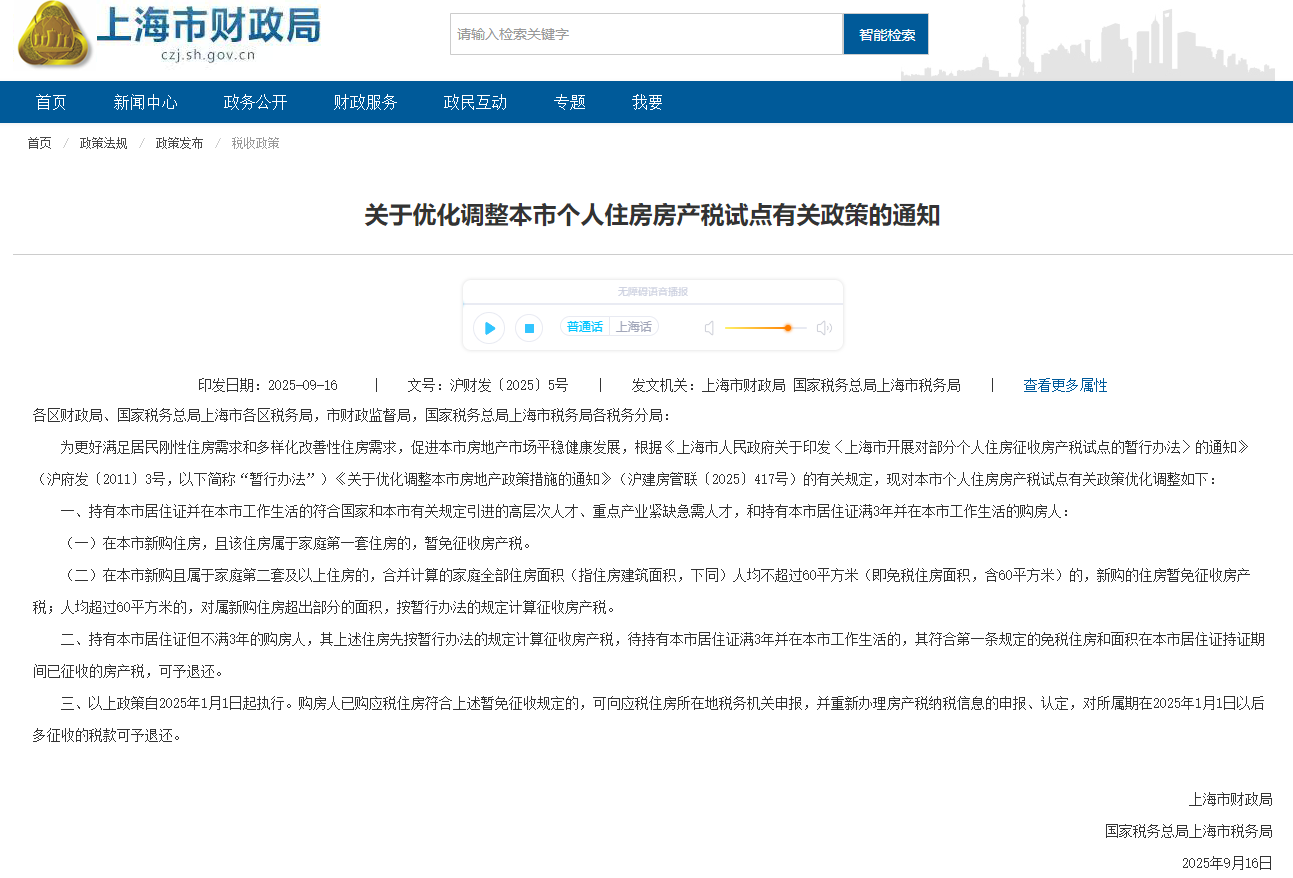 上海:符合条件购房人购买家庭首套住房暂免征收房产税