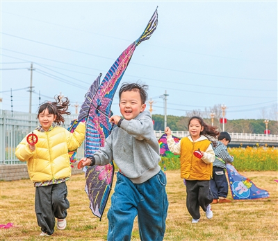 3月19日,江苏省扬州市江都区实验幼儿园小朋友在通扬运河畔放飞风筝,乐享春日美好时光。