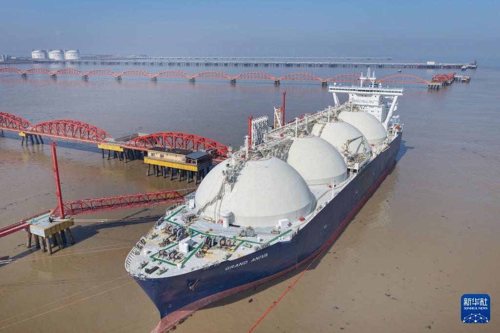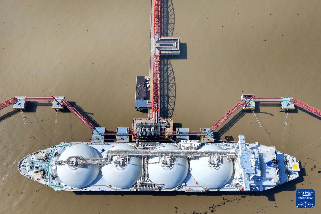 4月24日,外籍LNG船“阿尼娃”轮靠泊如东洋口港中石油江苏LNG接收站码头(无人机照片)。新华社发(许丛军摄)