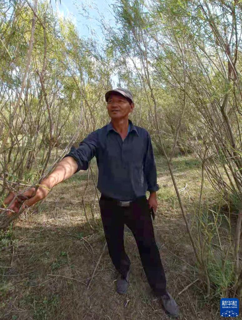 8月26日,牧民乌兰达来在毛乌素沙地中检查树木生长情况。新华社发