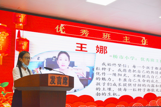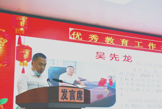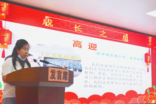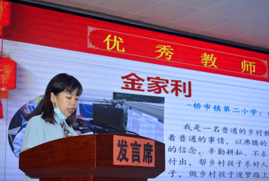 随后,“优秀教育工作者”代表吴先龙、“优秀班主任”代表王娜、“优秀教师”代表金家利、“成长之星”代表高迎作了交流发言。她们谈了自己的班级管理妙招、关爱留守学生心得、关心乡村教育做法,如何成长为新时期师德高尚的“四有好教师”经验;桥市镇初级中学吴先龙校长的勤恳敬业、以身作则、求真务实的治校方略及甘为桥中成长奠基石的崇高情怀,得到与会领导和教师的肯定。