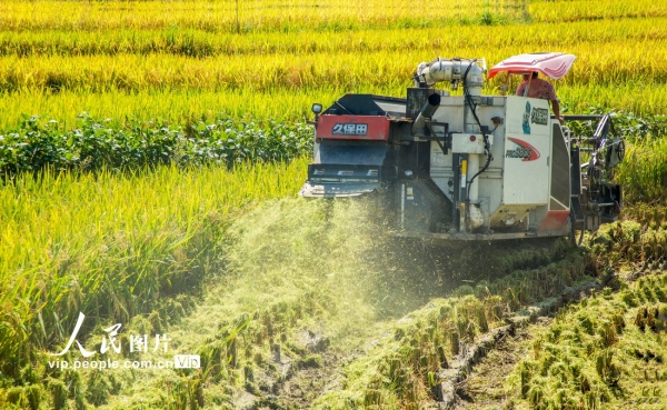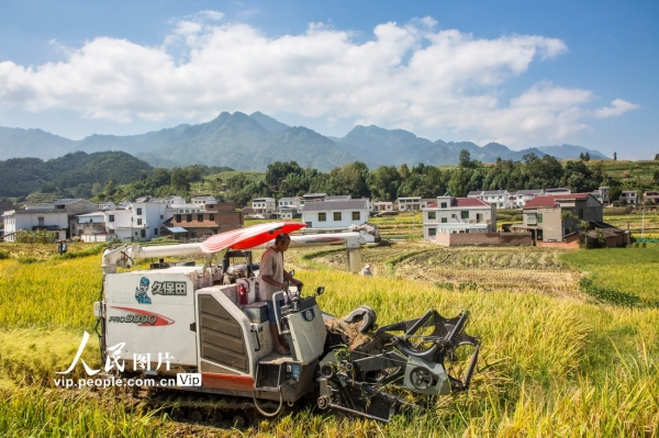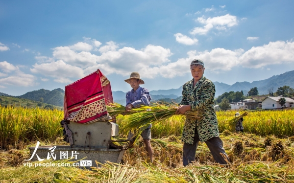 湖北省十堰市竹溪县30余万亩稻谷进入抢收高峰期,当地农民抢抓晴好天气收割、整理晾晒稻谷归仓。温大树摄(人民图片网)