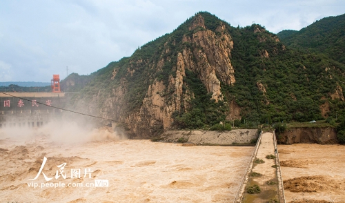 2021年10月7日,山西省运城市平陆县黄河三门水利枢纽正全孔开启泄洪,应对3号洪峰。姜桦摄(人民图片网)