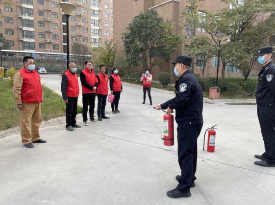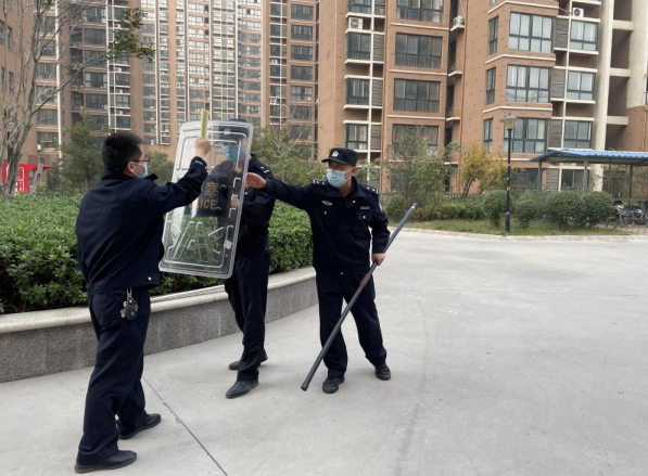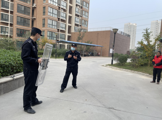 培训现场,刘源首先介绍了近期有关消防事故的典型案例,指出防火安全在秋冬季节丝毫不能松懈。针对颐和美丽园小区内高层建筑多、灭火器配备完整的特点,重点培训了消防灭火器正确使用方法、发现“小火”的扑灭方法、发生火灾后防烟自救逃生方法,其次针对物业公司强调了电动车不允许推上楼的预防方法。郭鹏飞结合近期案例,对义警队伍防范个人极端暴力情形进行了详细讲解,针对小区安保力量已经配备的长棍、盾牌、钢叉等防御设备进行专业培训,使平安义警队伍快速掌握其规范、安全的使用方法,现场配合社区辅警,重点突出了“棍盾结合、叉盾结合”的配合,演示了防御个人极端暴力的处置方法。并且强调遇到类似情况一定不要慌乱,采取“拉开距离—找到掩体—积极施救”的三段方法来处置应对。