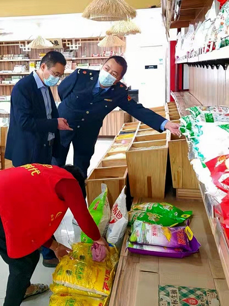 执法人员检查米、面、油市场。李芸/摄