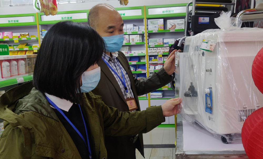 柳州市市场监管局执法人员在当地一家药店检查医疗器械销售情况。吕陈摄