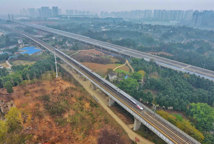 2020年12月24日,G8607次“复兴号”高铁列车从成都东站出发开往重庆沙坪坝。新华社记者 刘坤 摄