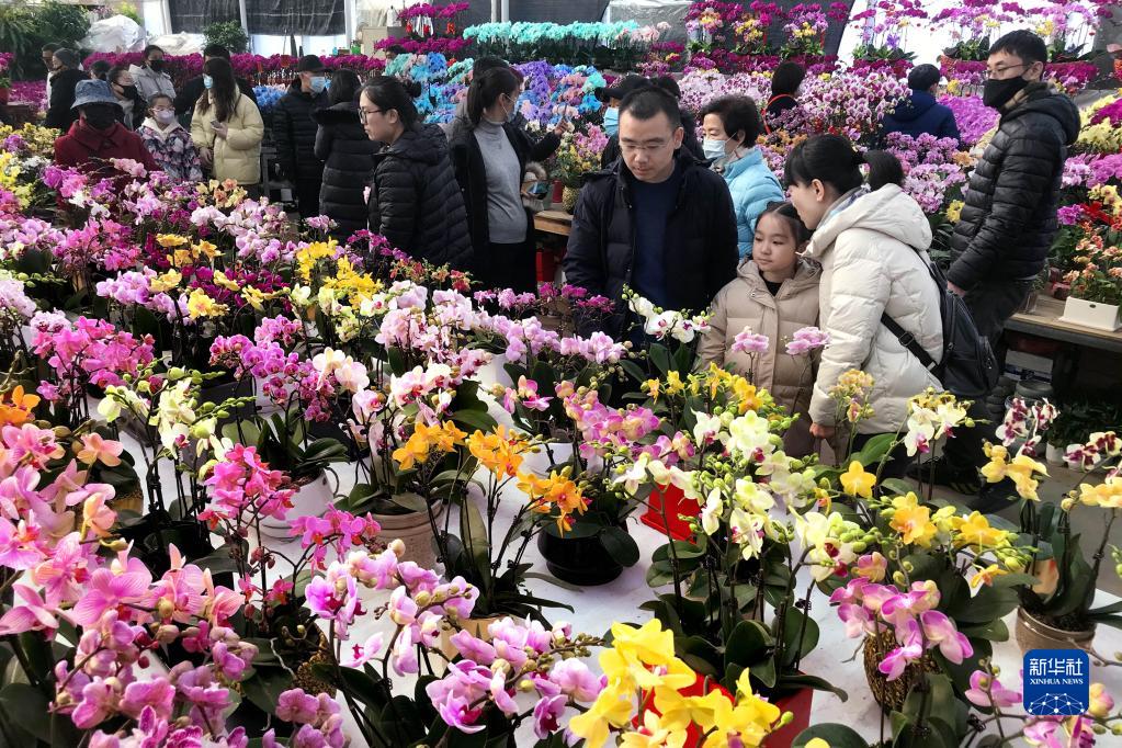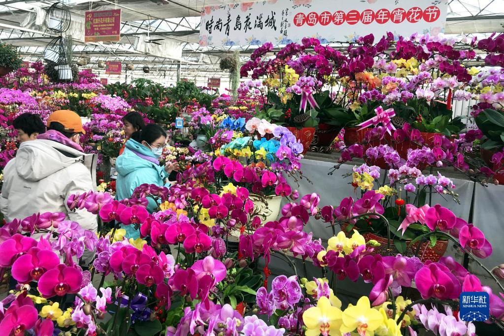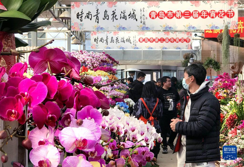 1月16日,顾客在青岛市崂山区枯桃花卉市场“年宵花节”上挑选鲜花。春节临近,青岛市各大花卉市场鲜花争奇斗艳,洋溢着喜迎新春的气息。新华社记者 李紫恒 摄