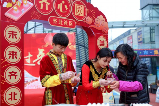 当日,浙江省湖州市长兴县龙山街道开展“齐心圆 迎新年”为主题的迎新春联谊活动,辖区内少数民族学生、外来务工人员、社区居民等齐聚一堂,参加写春联、剪窗花、包汤圆等迎新春活动,共享温馨时光。(记者 徐昱 摄)
