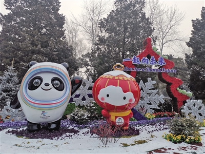 今年,北京市属公园迎冬奥庆春节环境布置以喜庆的中国红和冰雪迎冬奥元素为主基调,运用冬奥吉祥物冰墩墩、雪容融、雪花、冰丝带、市属公园生肖吉祥物等多种元素。公园还选用蓝粉云杉、龙柏球、大叶黄杨等耐寒植物丰富花坛的色彩和质感,并将园林废弃物加工处理成为花坛有机覆盖物,突出了北京冬日的冬奥、春节氛围和园林特色,体现了节约、环保的理念。