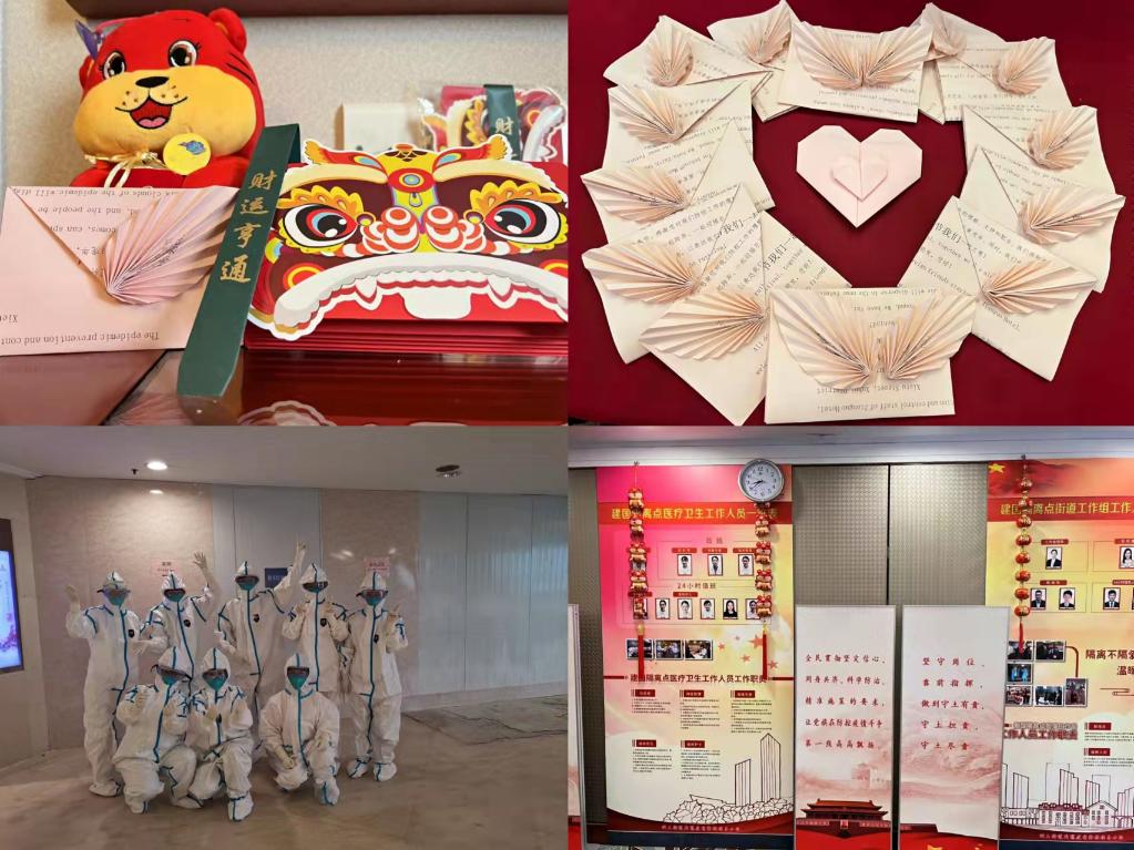 从王俊发来的照片可以看到,隔离点里防疫工作有序、春节氛围浓厚,大红的窗花、灯笼、老虎吊饰,还有医护人员利用休息时间为隔离人员准备的中英文感谢信:疫情无情人有情,感谢您对我们防控工作的理解、支持和配合……
