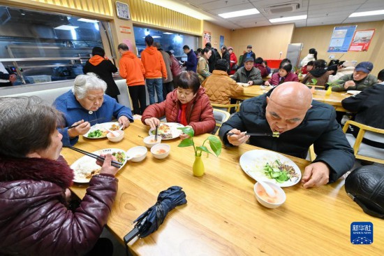 2月18日,老人们在福州市晋安区象园街道近邻长者食堂吃晚餐。