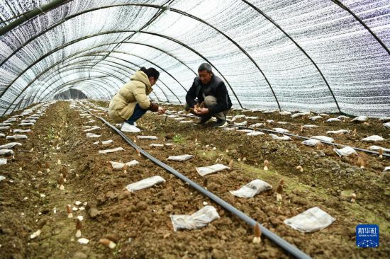 2月26日,在贵州省遵义市一现代农业产业园区,村民在大棚里采收羊肚菌。
