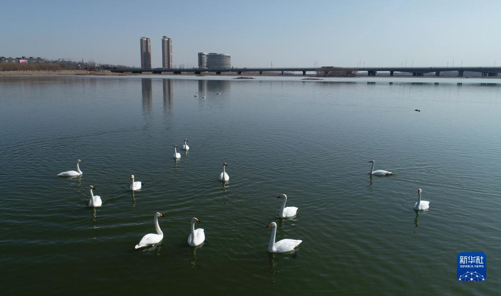 大天鹅在中卫市香山湖国家湿地公园游弋(3月2日摄,无人机照片)。随着气温逐步回升,宁夏中卫市香山湖国家湿地公园迎来二十多只大天鹅在此栖息、觅食。据了解,中卫市近年来积极实施推进宁夏黄河流域生态保护和高质量发展先行区建设,在黄河生态整治、滩区治理等一系列措施实施下,黄河湿地生态环境明显改善,每年春秋季节都会迎来大批候鸟来此驻足。新华社记者 王鹏 摄