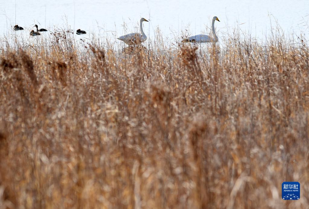 栖息在中卫市香山湖国家湿地公园的大天鹅(3月2日摄)。随着气温逐步回升,宁夏中卫市香山湖国家湿地公园迎来二十多只大天鹅在此栖息、觅食。据了解,中卫市近年来积极实施推进宁夏黄河流域生态保护和高质量发展先行区建设,在黄河生态整治、滩区治理等一系列措施实施下,黄河湿地生态环境明显改善,每年春秋季节都会迎来大批候鸟来此驻足。新华社记者 王鹏 摄