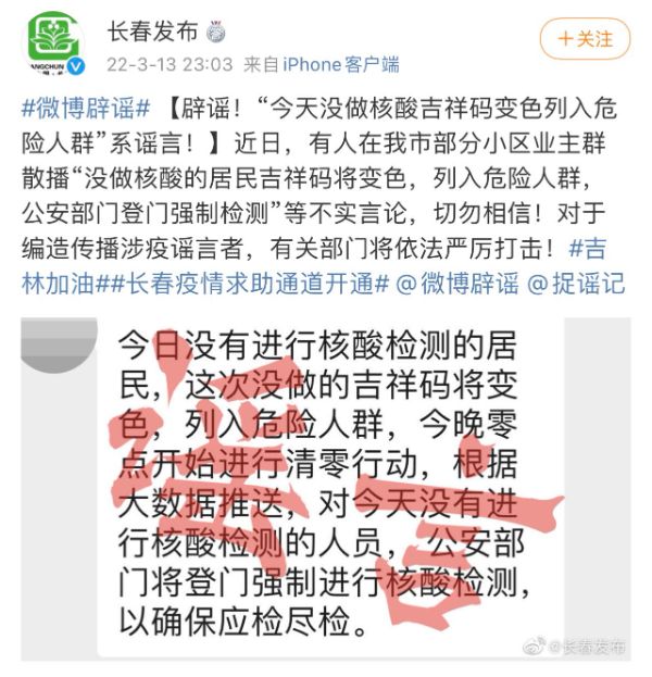 3月13日晚,“长春发布”官方微博发布消息回应,该内容为不实言论,并提醒网民切勿相信。对于编造传播涉疫谣言者,有关部门将依法严厉打击。