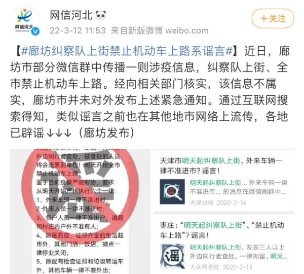 近日,在河北省廊坊市,部分微信群中传播一则涉疫信息“纠察队上街、全市禁止机动车上路”。