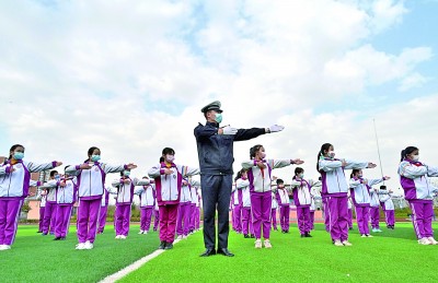 3月28日,河北省邯郸市峰峰矿区公安交通警察大队的民警在指导峰峰矿区外国语实验小学的学生们学习交通指挥手势。当日是全国中小学生安全教育日,河北省邯郸市峰峰矿区外国语实验小学联合峰峰矿区公安交通警察大队开展“强化安全意识、提升安全素养”安全教育日主题活动,通过形式多样的活动,寓教于乐地让学生们学习道路交通安全常识,增强学生们的安全意识。(郝群英摄/光明图片)