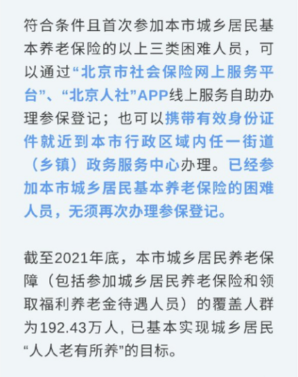 中新网3月29日电据北京市人力资源和社会保障局官方微博29日消息,北京市人力资源和社会保障局发布2022年城乡居民基本养老保险缴费标准,今年的缴费标准与去年相同,最低缴费标准为年缴费1000元,最高缴费标准为年缴费9000元,参保人可在这个区间内自选缴费金额。符合条件的参保人从今年4月1日起,到今年12月10日,均可以办理参保缴费手续。