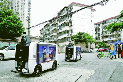 4月25日,无人快递车行驶在上海市杨浦区长海路街道浣纱小区内。为帮助解决该小区物资配送难题,上海理工大学菜鸟驿站安排了两台无人快递车进驻,将物资配送到居民家门口。新华社记者 张建松摄