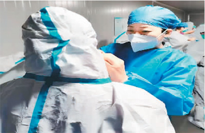 杜长丽(右)检查上班人员穿防护服。 |